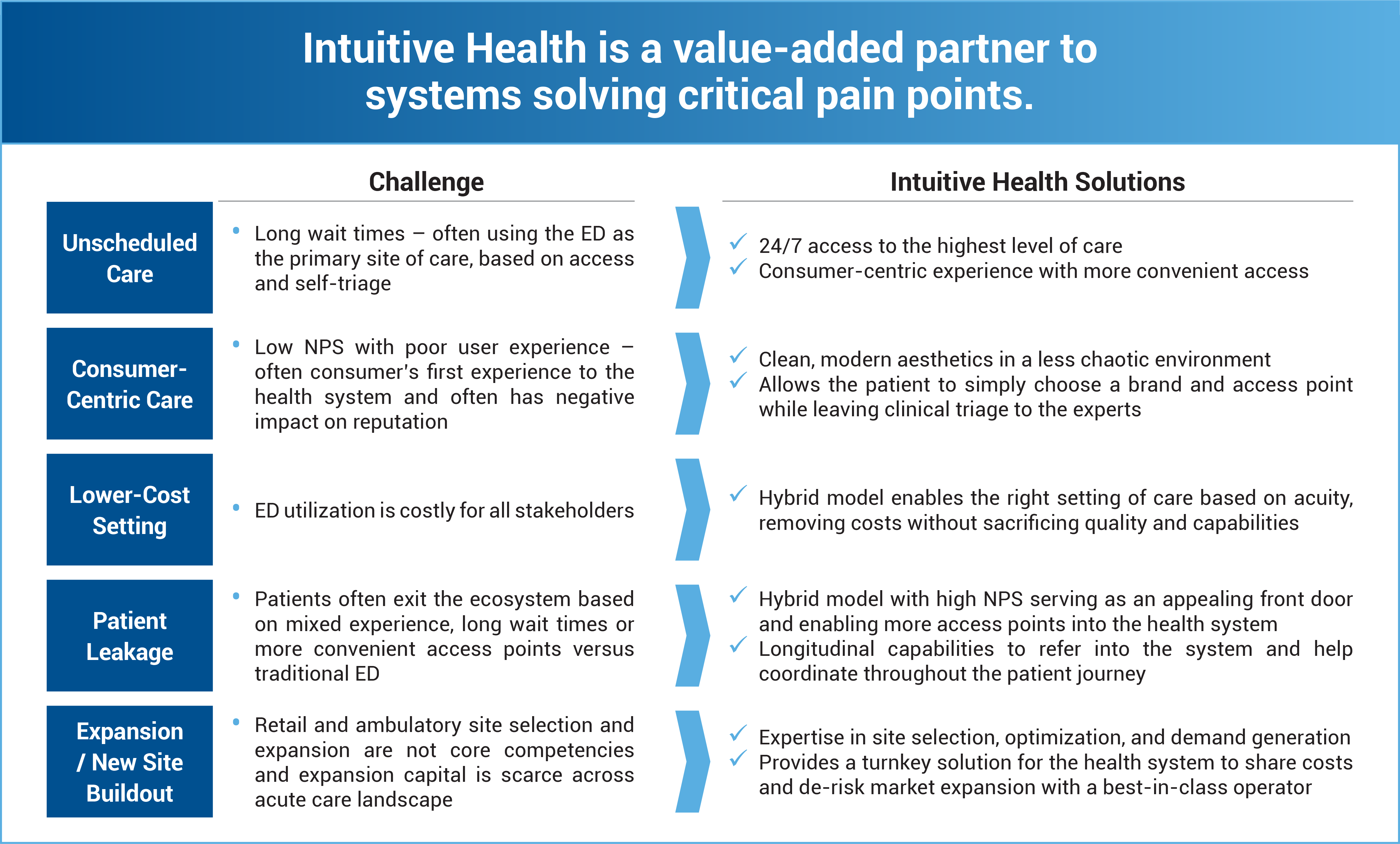 As measured by Net Promoter Score (NPS), Intuitive Health patients are much more satisfied with the dual model than other available models. Implementing a system that values servant leadership and customer satisfaction, the Intuitive Health hybrid ER and urgent care model better meets patients’ healthcare needs.